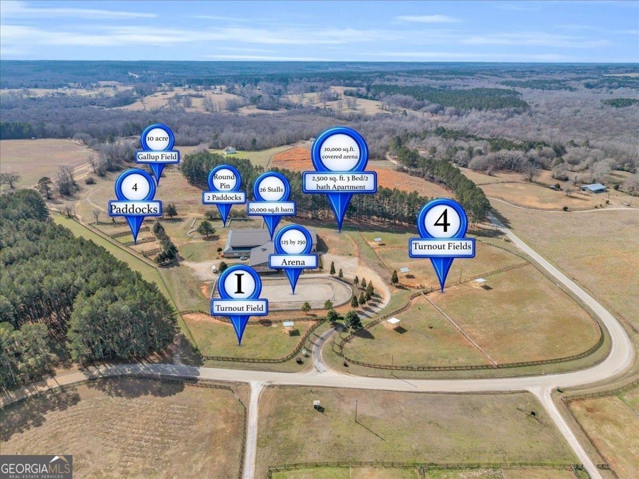 State-of-the-art equestrian facility on 25 rolling acres in the heart of Madison's renowned horse country. Purpose-built for dressage training and clinics, this exceptional property offers both indoor and outdoor arenas, a 26-stall barn, extensive turnout, and on-site living. The 20,000 sq ft indoor arena features Euro Felt footing, a wall of mirrors, upgraded LED lighting, a sound system, and a newly constructed viewing room. Outdoor amenities include a 125' x 250' arena, round pen, six individual paddocks, five large turnout fields each equipped with a run-in shed, and a 10+ acre gallop field, all supported by four-board and electrical fencing. The 10,000 sq ft barn includes 26 stalls (12x12 to 12x16), three wash rooms, two temperature-controlled tack rooms, office space, laundry room, and a full bath with tiled shower. There are two apartments roughly 2,800 square feet offering flexible living with multiple bedrooms and baths, a remodeled kitchen, and updated systems-ideal for owners, staff, or guests. Additional highlights include a 50+ GPM artesian well, tankless water heater, reinforced paddocks, new siding panels, new sewer pump and drain field, skirt board installation, and approximately five additional acres cleared. Multiple ideal building sites complete this rare offering. A truly turnkey equestrian property designed for serious horsemen, training programs, or private estate use.