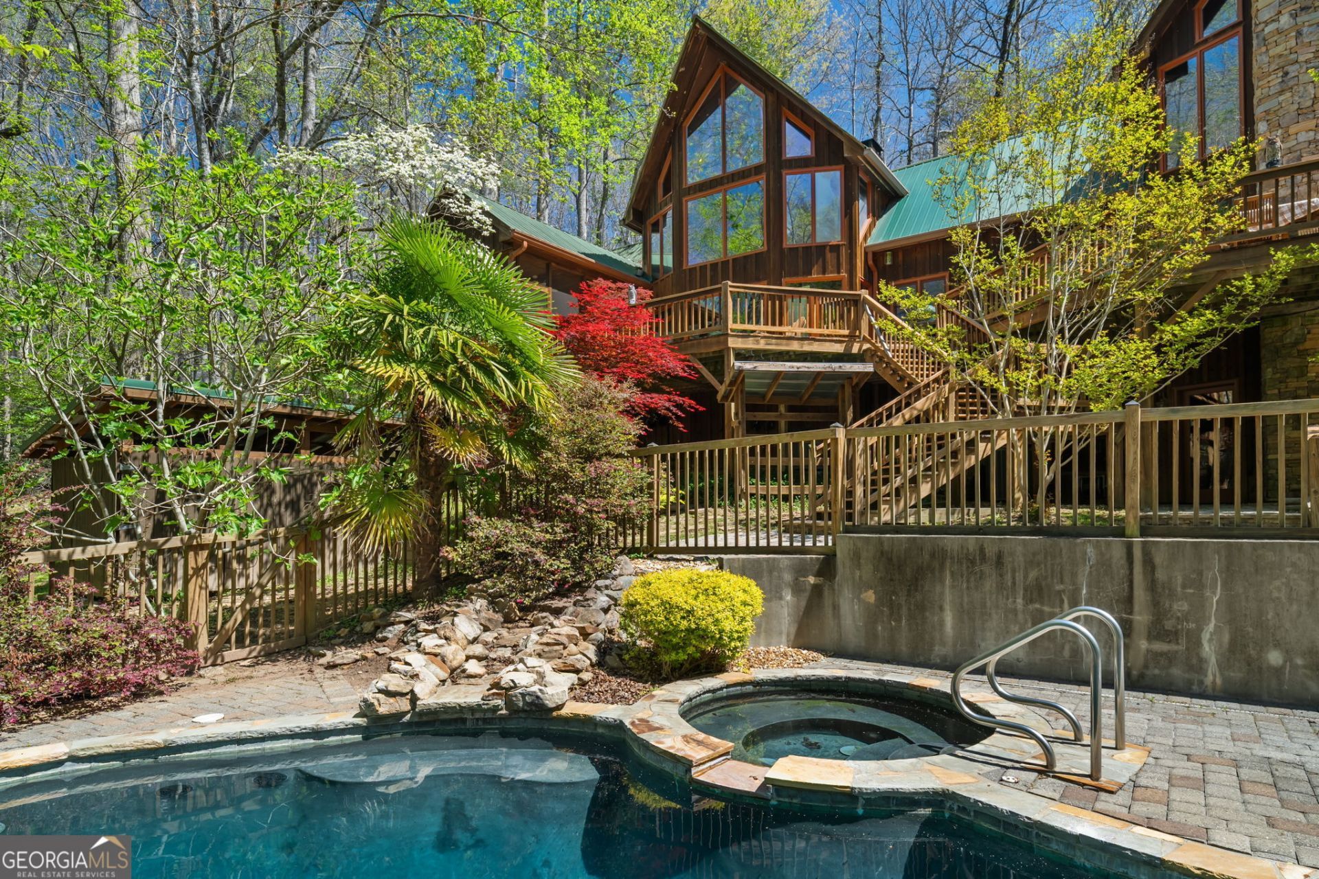 Enjoy the ease of peaceful estate living on more than 11 rolling acres, where this ski-lodge inspired home sits like a private retreat overlooking a walk-out pool and lovely stream view. Tucked away, yet well connected, this property lies just minutes from renowned vineyards and charming mountain towns, like Dahlonega and Helen, with quick access to GA-400 and only an hour away from the shops and restaurants of Milton and Alpharetta. Atlanta's international airport is an easy hour and a half away, as you return home along smooth roads and a paved curved driveway approaching this secluded estate. As you enter through the wood paneled foyer into the family room, the home immediately reveals its most captivating features - a two-story view of the wooded landscape, pool and river, warmed by a wood burning stove and walk out to an expansive wrap deck. To the left of the foyer sits a spacious main-level bedroom, perfect for guests, an office, or convenient single-level living. To the right is the chef's kitchen, featuring a Wolf range, upscale appliances, and striking granite countertops - also with walk out to the deck, where you may host large and small gatherings. As you walk through the kitchen, you are led to the grand gathering and dining space, anchored by a soaring stone masonry fireplace that rises dramatically toward the vaulted ceiling. Another two-story wall of windows brings the outdoors inside, offering a stunning backdrop for meals and celebrations. Completing the main level is a sunroom or artist's studio, where arched floor-to-ceiling windows fill the space with light. An adjoining breezy screened porch completes the main floor. Upstairs is the primary suite with private bath and large his and her closet. The lower terrace level offers a cozy gathering area with masonry fireplace, flanked by two generous bedrooms and a bath, and well-appointed laundry room with sink and abundant cabinetry for storage. Just steps away, the detached two-car garage includes a bonus space affectionately known as the Gingerbread House-a charming over-garage air-conditioned apartment, suitable for guests or a retreat for the creative writer. Outside, stone walls and meandering pathways wind through curated native trees and flowering shrubs - a landscape intentionally designed to bloom with color and texture throughout the seasons. Gazing from the deck affords a beautiful view of a bend in the Tesnatee Creek where you may still pan for alluvial gold. The cleared, level lower yard between the pool and creek is ideal for badminton games or soccer practice. The 44 foot pool with spa is perfect for relaxing or swimming laps. Additional amenities include custom-covered RV parking with electrical service, and a second covered parking area with power. Irrigation and solar panels complete the exterior features. This property offers a rare opportunity for mornings to begin with coffee, birdsong, and the rush of a waterfall accompanying your remote workday or creative endeavors in the sunroom/studio, where landscape, woodlands, springs and creek align to create an environment of luxury and charm.
