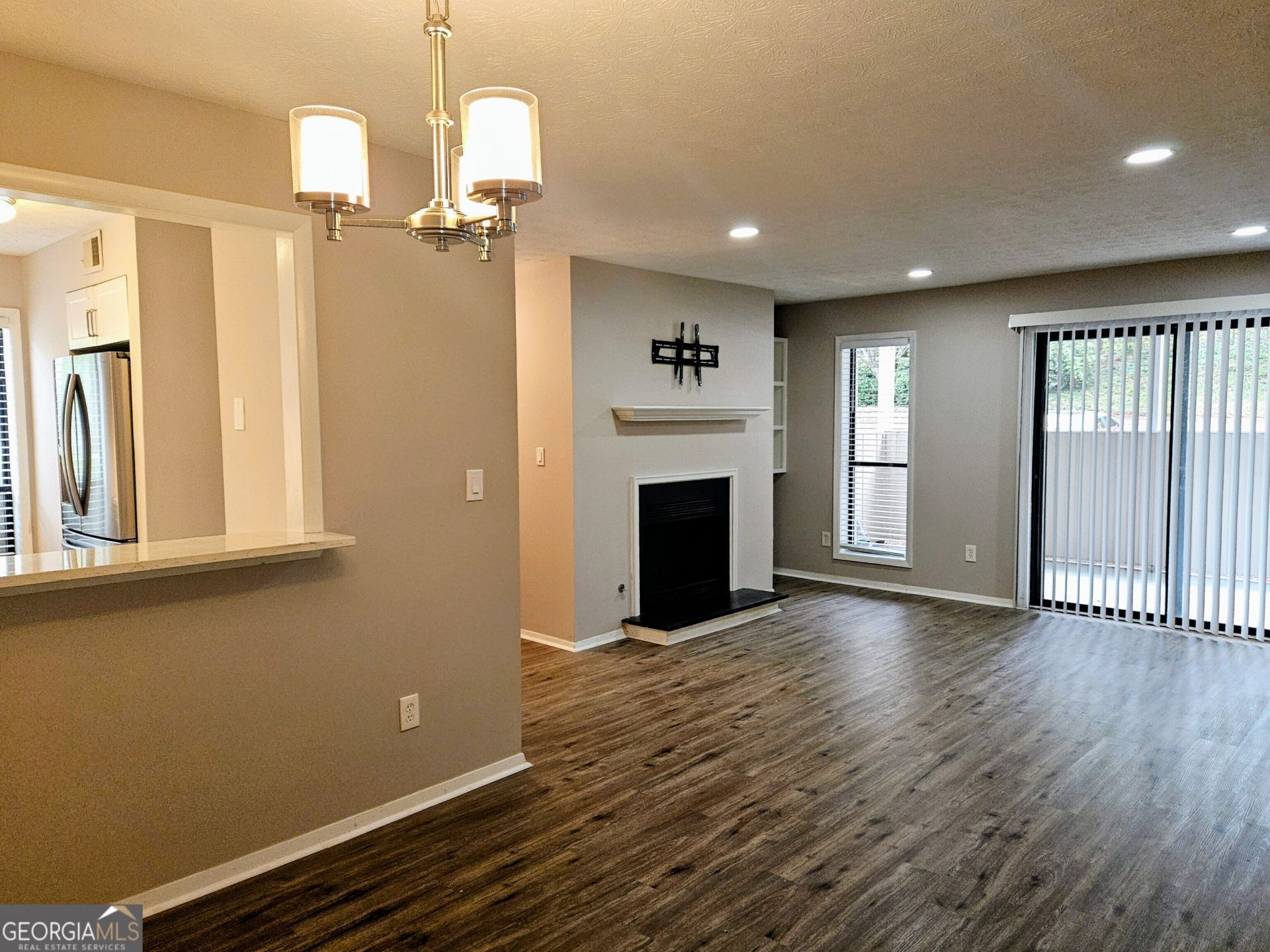 Beautifully renovated and move-in ready, this first-floor Wynne's Ridge condo blends modern updates with unbeatable convenience and location. Featuring brand-new LVP flooring throughout, fresh interior paint, new interior doors, and recessed lighting in both the living room and bedroom, the home offers a bright, polished feel from the moment you enter. A cozy fireplace adds warmth and character to the living space for relaxing at home. The updated kitchen is finished with white shaker cabinets, granite countertops, white subway tile backsplash, stainless steel appliances, side-by-side refrigerator, and a breakfast bar overlooking the dining area. The bath boasts a modern vanity, updated mirrors, new lighting, and a spa-style shower. Washer and dryer remain. Step outside to a covered patio ideal for quiet mornings, relaxing evenings, or casual entertaining. Set in a prime Marietta location near I-75, I-285, Truist Park, shopping, and dining, this is low-maintenance living with elevated appeal.