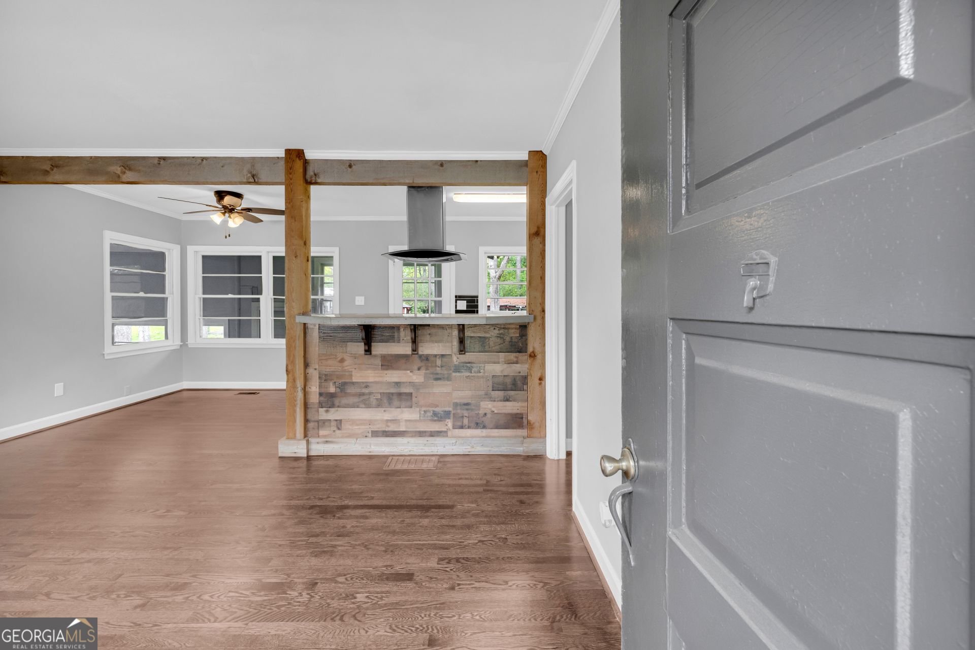 Updated 2 bedroom 1 bath home in the city of Commerce. Open Living and Kitchen area with stainless appliances including a gas range. Refrigerator and stackable washer/dryer remains with home. Outside and inside recently painted. Beautiful site finished hardwood floors throughout. Bonus space could be used for workout area, at home office or craft space. Level front and back yard with a storage building and shed out back. Conveniently located in Commerce near shopping and dining options.