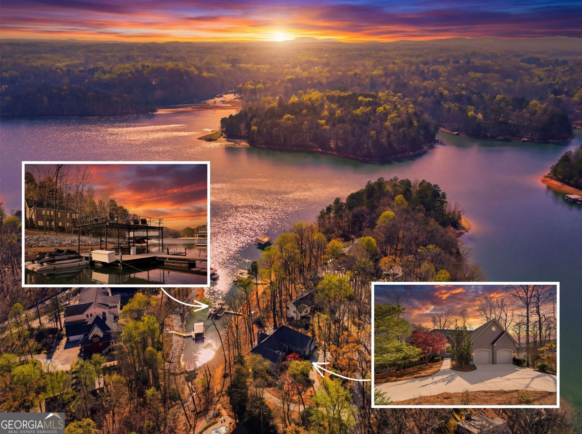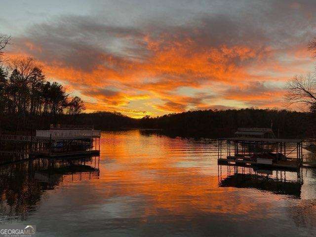 Where sunrise meets sunset, this exceptional Lake Lanier retreat offers unmatched water views from many bedrooms, many windows, and every level of the home-a rare opportunity to truly live on the lake, not just near it. Zoned for highly sought-after Forsyth County schools and benefiting from Forsyth County taxes, this location offers the perfect blend of lake living and everyday convenience. Tucked into a deep water cove (approximately 14 feet, recently dredged), the property features a fully updated private dock with boat lift, party deck, and electric, and a rare double jet ski port, all easily accessed by a lighted pathway with stairs. Spend your evenings on the dock's party deck as the sun sets across the water, or enjoy quiet mornings watching the sunrise with coffee in hand. When you're ready to explore, you're just approximately 15 minutes by boat to Pelican Pete's, one of the lake's most popular waterfront destinations. Inside, the main level is designed to maximize both views and livability, featuring tray and vaulted ceilings throughout, including a tray ceiling in the dining area and soaring vaulted ceilings in the sunroom and main living space. Rich hardwood flooring flows through the main living areas, complemented by carpeting for comfort. The living room, anchored by a fireplace, opens directly to the upper deck, creating a seamless indoor-outdoor experience. The sunroom offers a stunning vantage point to take in the water year-round, while the kitchen features quartz countertops, freshly painted cabinetry, electric range, built-in wine rack, walk-in pantry, and a sunny breakfast nook overlooking the lake. A spacious laundry room with sink and storage adds everyday convenience. The oversized primary suite on the main level is a true retreat, offering tray and vaulted ceilings, expansive lake views, and direct access to the main-level deck. The spa-like ensuite includes separate vanities, a built-in makeup station, soaking tub, walk-in shower, and dual walk-in closets. The lower level continues the theme of views and access, featuring four secondary bedrooms, all with lake views and direct access to outdoor living, along with two full baths. One bedroom is constructed as a concrete storm room for added peace of mind. A second living area with fireplace and a built-in wet bar provides the perfect space for entertaining, while a large workshop with built-ins offers flexibility for hobbies, storage, or office use. An additional cedar storage closet enhances organization. The terrace level offers even more versatility with a separate driveway, additional two-car garage, and a dedicated fitness or flex space, ideal for a gym. Outdoor living is elevated with multiple levels of decking, all connected by three flights of stairs, allowing easy flow between levels and down to the lake. The terrace level also offers walkout access, further enhancing the connection between indoor and outdoor spaces. Additional highlights include a four-car garage (two on main, two on terrace level), circular driveway, central vacuum system, Ecobee smart thermostats, three HVAC systems, a 2025 roof, and a 2025 water heater, updated exterior lighting, and a recently repaved shared path. This is more than a home-it's a front-row seat to the Lake Lanier lifestyle, where every detail is designed to maximize views, comfort, and connection to the water.